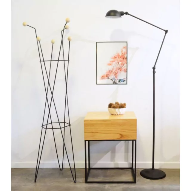 Materiales: Hierro trefilado pintado al horno de 8mm y puntas en madera maciza torneada.